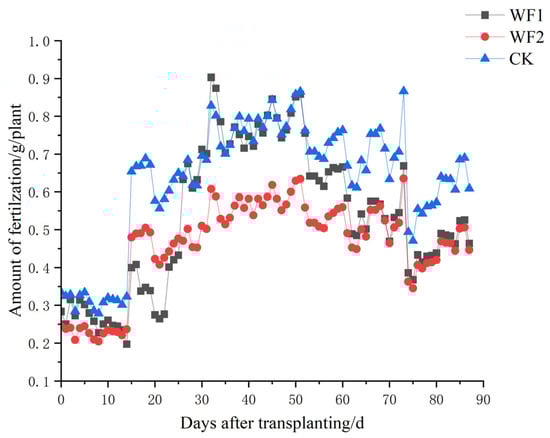 Secondly, as shown in Figure 10 and Figure 11, fluctuations in water and fertilizer consumption were observed in the WF1 treatment, particularly the decreases between days 7 and 15 and around day 75 after planting. These trends deviate from the typically high demand expected during active growth phases. We attribute these deviations primarily to significant weather events that occurred during these periods, as captured in our environmental data (Figure 9). Specifically, the reduced water consumption from days 7 to 15 (Figure 10) coincided with a period of consecutive rainy days, following an initial 6 days of sunny weather. This increased natural water availability likely reduced the plants’ irrigation needs, leading to a downward adjustment by the dynamic management strategy. Similarly, the marked decrease in both water and fertilizer consumption around day 75 (Figure 10 and Figure 11) corresponded with a sudden temperature drop of approximately 10 °C, which persisted for about one week. These weather events undoubtedly influenced plant physiological processes, likely leading to a temporary reduction in growth rate, and consequently a decreased demand for both water and nutrients. The dynamic adjustments made by the WF1 strategy during these periods reflect their responsiveness to these changes in plant needs, as indicated by the altered growth indicators (stem diameter and plant height). While these weather-induced fluctuations highlight the strategy’s sensitivity to external environmental factors, they also demonstrate their ability to adapt to changing conditions. It is important to emphasize that the primary function of the dynamic management strategy is to optimize resource allocation based on real-time plant requirements, which may vary considerably in response to the prevailing environmental conditions.