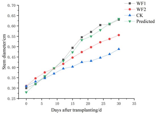 Growth of tomato stem diameter under different water and fertilizer treatments (WF1, WF2, and CK), with predicted values.