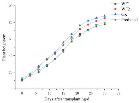 Growth of tomato plant height under different water and fertilizer treatments (WF1, WF2, and CK), with predicted values.