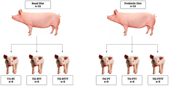 The two factors, maternal diet and creep diet, were arranged in a 2 × 3 factorial design, resulting in six experimental groups as follows: (T1)—BT (basal sows and piglets supplemented with 0.22% SID Trp); (T2)—BTT (basal sows and piglets supplemented with 0.27% SID Trp); (T3)—BTTT (basal sows and piglets supplemented with 0.33% SID Trp); (T4)—PT (probiotic sows and piglets supplemented with 0.22% SID Trp); (T5)—PTT (probiotic sows and piglets supplemented with 0.27% SID Trp); (T6)—PTTT (probiotic sows and piglets supplemented with 0.33% SID Trp) (see Figure 1).