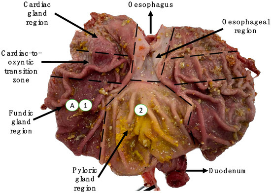 Euthanasia was completed by a competent person in a room separate from other piglets. The piglets were not fasted prior to sacrifice. The stomach was dissected from the gastrointestinal tract at the esophagus and the duodenum. The stomach was weighed (full stomach weight), and the pH of the stomach was measured by inserting a pH probe meter (HI-98190, Hanna Instruments, Padovana, Padua, Italy) into the center of the lumen. The stomach was dissected along the greater curvature, the contents were removed, and the empty stomach was weighed (empty stomach weight). The stomach was gently rinsed with sterile PBS. For analysis of the expression of genes key to stomach functioning, one mucosal sample (1 cm2) was collected from the fundic and pyloric gland regions, at location 1 and location 2 in Figure 2, respectively. The tissues were rinsed in PBS, stripped of the overlying smooth muscle, and stored in RNAlater® solution (5 mL) overnight at 4 °C. The RNAlater® was removed twenty-four hours later, and the samples were stored at −80 °C. For immunohistochemical staining of parietal cells, tissue was collected from the fundic gland region, at location A in Figure 2. The tissue was gently rinsed with PBS, pinned to a backboard to maintain a flat structure and orientation, and submerged in 10% neutral-buffered formalin until processing.