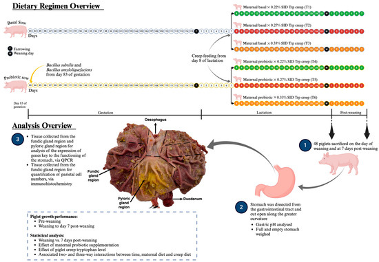 Within the stomach, the fundic gland region plays a crucial role in acid and digestive enzyme secretion, while the pyloric gland region is the primary site for the secretion of gastrin and somatostatin, which are key regulators of gastric acid secretion [18]. Parietal cells, located in the fundic region, are specifically involved in acid secretion within the stomach. The selection of genes for analysis, in both the fundic and pyloric gland regions in the current study, was based on their functional role in the acid, digestive enzyme, and immune pathways, as previously determined in the different regions of the stomach by Kiernan et al. [18]. Therefore, the objectives of this study were twofold: to investigate stomach characteristics, parietal cell numbers, and the expression of genes essential to the functioning of the fundic and pyloric gland regions at weaning compared to seven days post-weaning and to examine whether maternal probiotic (Bacillus subtilis and Bacillus amyloliquefacien) supplementation or piglet dietary Trp levels influence these gastric parameters.