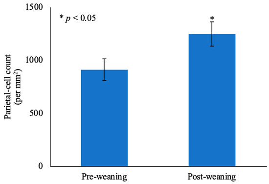 The effect of time on parietal cell numbers per mm2 in the fundic gland region is presented in Figure 4. The number of parietal cells per mm2 of fundic gland tissue was greater at 7 days post-weaning compared to at weaning (1250 vs. 913, SEM = 104) (p < 0.05). There was no effect of maternal, creep, maternal × creep, time × maternal, or maternal × creep × time interaction on the number of parietal cells at weaning or at 7 days post-weaning (p > 0.05; data not presented).