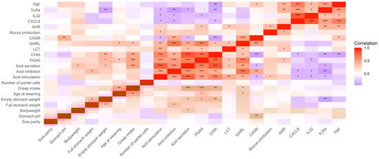 Correlation matrix illustrating Pearson correlations of pyloric gland region gene expression and physiological parameters at weaning. Positive (red) and negative (blue) correlations are represented in color strength on a scale of −1 to 1. * p < 0.05, ** p < 0.01, *** p < 0.001.