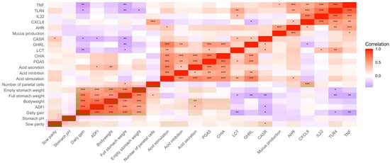 Correlation matrix illustrating Pearson correlations of pyloric gland region gene expression and physiological parameters post-weaning. Positive (red) and negative (blue) correlations are represented in color strength on a scale of −1 to 1. * p < 0.05, ** p < 0.01, *** p < 0.001. ADFI, average daily feed intake.