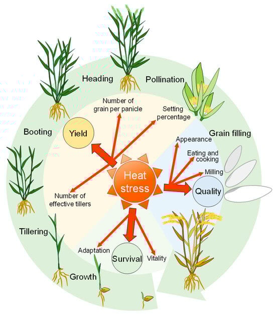 Rice is highly sensitive to heat stress throughout its growth and development stages. During the seedling stage, the optimal growth temperature for rice is 28 °C during the day and 22 °C at night, when temperatures exceed 32 °C, the growth and development of rice are affected across all stages. For instance, the heading stage is advanced to avoid heat damage, and the elongation of the hypocotyl and petiole helps maintain an appropriate plant architecture; stomatal closure and increased trichome density aid in maintaining plant water content. These thermomorphogenic responses mitigate the adverse effects of warm temperatures on rice growth []. Temperatures above 35 °C can severely restrict grain filling and yield [,,,]. As a sessile organism, rice has evolved a sophisticated set of response mechanisms to heat stress over the course of its long-term evolution. Therefore, an in-depth investigation into the molecular mechanisms underlying the response to heat stress is conducive to the development of rice varieties with enhanced heat tolerance. Firstly, this review provides a comprehensive overview of the effects of high-temperature stress on yield and quality across different growth stages of rice, then delving into the impact of high-temperature stress on the physiological mechanisms of rice, outlines the response mechanisms and molecular regulatory networks of rice to high-temperature stress, and finally discusses the improvement in heat tolerance in rice varieties using the identified superior haplotypes/QTLs and gene editing technologies. It also proposes the idea of leveraging gene editing in conjunction with artificial intelligence to discover new heat tolerance genes and create heat-tolerant rice germplasm, thereby breeding heat-tolerant rice varieties.