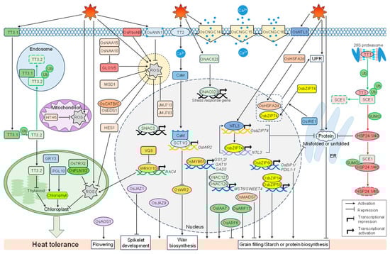 Transcription factors play a crucial role in plant thermotolerance. After rice perceives heat stress and transduces the signal into the cell, transcription factors from families such as NAC, MYB, WRKY, and bZIP in the nucleus activate corresponding transcriptional regulation and initiate the expression of heat stress resistance genes. Generally, heat shock transcription factors (HSFs) can bind to specific regions known as heat shock elements in the promoters of heat shock protein (HSP) genes to regulate their expression and counteract heat stress []. Under high-temperature stress, OsHSFA2d is selectively spliced into a transcriptionally active form that is localized only in the nucleus and may respond to heat stress through the unfolded protein response pathway []. The rice WRKY transcription factor OsWRKY10 negatively regulates thermotolerance. The overexpression of OsWRKY10 promotes ROS accumulation in chloroplasts, making plants more sensitive to heat stress and prone to death under high-temperature conditions []. It has been found that the protein VQ8, containing a valine-glutamine (VQ) motif, inhibiting the DNA-binding activity of OsWRKY10 to prevent its transcriptional activation of target genes such as NAC4, thereby repressing heat sensitivity caused by OsWRKY10-mediated ROS balance and hypersensitive response []. A fusion expression construct of the OsHSP101 promoter and OsWRKY11 cDNA, when overexpressed, significantly enhances thermotolerance and drought tolerance in transgenic plants [].