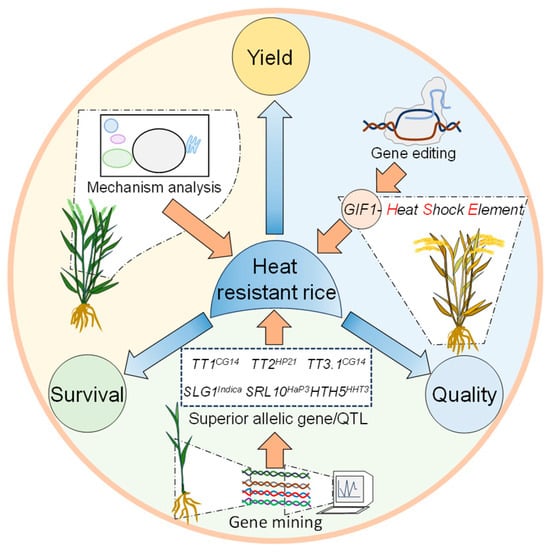 The exploration of excellent genetic resources is of great significance for the breeding of high-quality rice varieties and the sustainable development of agricultural production. Up to now, we have utilized a number of superior alleles and QTLs to improve rice varieties, enabling rice to maintain good growth and stable yield under heat stress conditions (Figure 3).