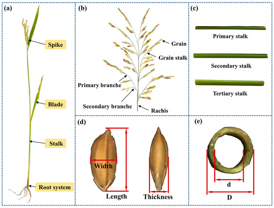 Structural characteristics of rice plants. (a) Whole structure of rice plant. (b) Spike structure. (c) Stalk structure. (d) Grain size. (e) Stalk cross-section.