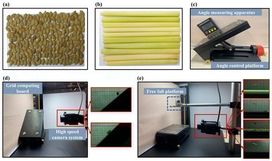 To enhance the accuracy of the rice discrete element model and optimize its practical application, it was essential to precisely measure the contact parameters between the various components of the rice and the steel and acrylic materials, as well as the rice structure itself. The primary branches, secondary branches, rachis, and stalks of the rice plant were categorized collectively as stalks, and the contact parameters between the grains, stalks, and the steel and acrylic materials were assessed. The grains and stalks were evenly adhered to different cardboards to create grain boards and stalk boards, which were utilized to measure the contact coefficient of the plant structure itself, as illustrated in Figure 2a,b. The coefficients of static friction, rolling friction, and restitution were measured using the grade test, slope rolling test, and drop test, respectively, as illustrated in Figure 2c–e. Detailed measurement methods and results are shown in the attached Appendix Table A2 and Table A3.