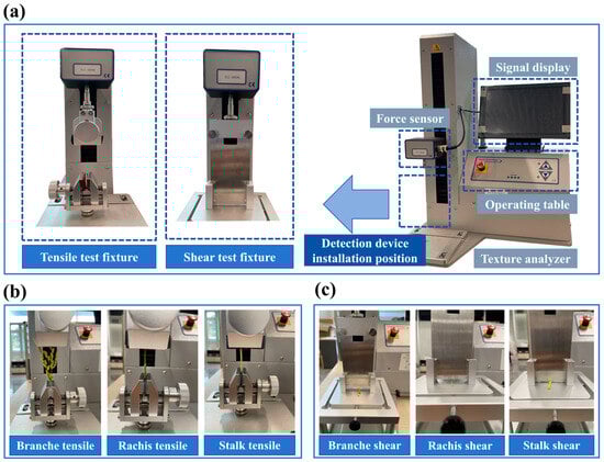 As illustrated in Figure 3a, a texture analyzer (model: TMS-Pilot, force resolution: 0.01 g, distance accuracy: 0.001 mm, Food Technology Corporation, Sterling, VA, USA) was employed to investigate the mechanical properties of rice. The analysis focused on the grain stalks, primary branches, spikes, and three kinds of stalks undergoing tensile and shear tests. With the exception of the grain stalk, the length of the samples to act as structures in the other parts of the rice plant was 40 mm.