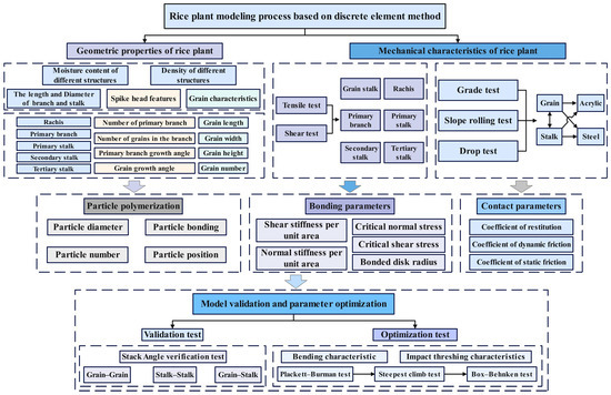 The purpose of this study is to establish an whole-rice-plant model that accurately reflects the bending and threshing characteristics of an actual rice plant, thereby enhancing the credibility of the simulation. Initially, this study measures the density, moisture content, contact characteristics, and mechanical properties of each structure of the rice plant, based on the characteristics of the rice plant. Subsequently, utilizing the Hertz–Mindlin contact model, a multi-dimensional element particle arrangement method is employed to establish a discrete element model of the entire rice plant. The bending and threshing characteristics of the model were calibrated using a three-point bending test and an impact threshing test. Finally, the contact characteristics of the model were validated using stack angle verification tests.