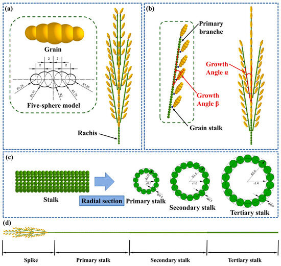 Based on the previously established structural characteristic measurements and mechanical characteristic tests, the whole-rice-plant model was established using the multi-dimensional meta-particle arrangement method. The modeling process is illustrated in Figure 4.