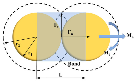 The bonding force between the particles was described by Hertzian contact theory. Notably, there was a significant distinction between the cross-sectional area of the solid particle stalk and the actual cross-sectional area. The cross-sectional area of the hollow ring stalk developed in this study provides a more accurate representation of the normal and tangential characteristics of the real stalk compared to the solid particle stalk. The Hertz–Mindlin band-bonding contact model was employed for interactions between particles, wherein forces and moments were transmitted at the contact points, as illustrated in Figure 6.