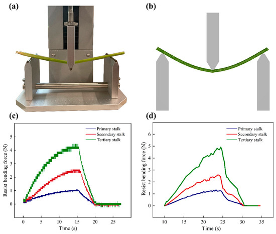 To calibrate the bending characteristics, the three-point bending test was conducted on the rice stalks. It was observed that the bending resistance strength of the rice stalk nodes was greater than that of the stalk, and the bending characteristics of the stalk nodes were less pronounced. Consequently, the bonding parameters at the stalk nodes were set to a mean value, and this study focuses exclusively on the bending characteristics of the stalk. Samples measuring 150 mm in length were selected from the middle of the primary, secondary, and tertiary stalks, respectively, with a span of 130 mm between the support points at both ends, as illustrated in Figure 7a. Prior to the test, pre-tests indicated that the stalk would undergo plastic bending if the descent depth exceeded 20 mm. Therefore, to optimize the bending characteristics of the stalk under radial loading while avoiding compression damage in the radial direction, the descent depth was limited to 15 mm. During the test, the initial position of the bending probe was set 10 mm above the support surface of the sample, and it was moved vertically downward toward the center of the sample. The loading speed was maintained at 60 mm/min, causing the stalks to bend under the applied load. Force changes began to be recorded upon contact between the probe and the sample, and when the probe descended to a depth of 15 mm, it was retracted at a speed of 180 mm/min, concluding the test. Each experimental group was repeated five times, and the average value was calculated. The curve of actual bending resistance force is shown in Figure 7c.