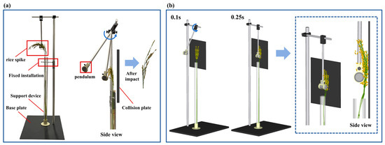To more accurately reflect the deformation and threshing conditions of rice plants under impact loads, we optimized the threshing characteristics of the rice model through impact threshing tests. As illustrated in Figure 8a, the experimental apparatus consists of a pendulum, base plate, support device, and fixed installation. The pendulum weighs 300 g and has a length of 250 mm. To determine the appropriate pendulum angle, a preliminary experiment was conducted prior to the formal testing. The rice plant was placed in the support device, and the initial angle of the pendulum was adjusted accordingly. During the experiment, the pendulum angle was set to 15°, 30°, 45°, 60°, 75°, and 90° to perform the impact tests. Upon release, the pendulum collides with the rice spike, resulting in the elastic bending of the stalk and the subsequent detachment of the grains. The number of grains that fell off after the impact was recorded, and the threshing rate was calculated. Each test at a given angle was repeated ten times, and the average value was computed. The formula for calculating the threshing rate is as follows: