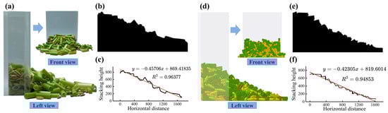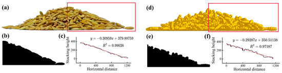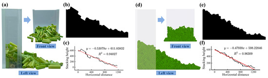 In the stalk–stalk stack angle test, the stalks were processed into 15 mm segments, resulting in a total of 200 segments. These stalks were placed in an acrylic box with dimensions of 80 mm × 30 mm × 60 mm. One side wall of the box was gradually raised to allow the stalks to move under the influence of gravity. The test results are presented in Figure 10a. For the simulation test, a particle factory was established at a height of 60 mm from the bottom of the container. Particles accumulated in the container due to gravitational forces, with a stalk particle generation rate of 1000 particles per second. After 1 s, the acrylic plate was slowly lifted at a speed of 0.1 m/s and subsequently allowed to fall, causing the particles to accumulate under gravity. The simulation test results are illustrated in Figure 10d. The total simulation time was 5 s, with a time step of 2 × 10−6, and test data were recorded every 0.01 s. The stalk–stalk stack image was processed using grayscale conversion and binarization, as shown in Figure 10b,e, while the linear fitting curves are depicted in Figure 10c,f.