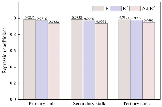 The shear device consisted of a shearing piece and a bottom plate. The shearing piece was oriented perpendicularly to the bottom plate. Additionally, the bottom plate featured guidance grooves. There was a slit in the bottom plate to cut the test sample with the shearing piece. The shearing tests were conducted using a texture analyzer and shearing device, as illustrated in Figure 3c. Prior to initiating the test, it was essential to define the zero level. Preliminary tests indicated that when the shearing device was positioned at −5 mm, the stalk was completely severed. The thickness of the shearing piece was set at 1 mm. The shearing device, along with the force sensor, descends at a loading speed of 60 mm/min until the sample is cut. Each test set was repeated five times. The shear forces are documented in Appendix Table A4, which presents the maximum, minimum, mean, and standard deviation values.
