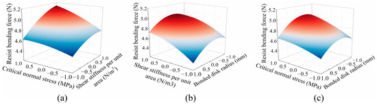 This study employed the Plackett–Burman screening test, the steepest ascent test, and the Box–Behnken optimization test to optimize the bending characteristics for the three kinds of stalk. The five bonding parameters—normal stiffness per unit area, shear stiffness per unit area, critical normal stress, critical shear stress, and bonded disk radius—were utilized as test factors, while the bending resistance force of the stalks served as the test index for parameter optimization. The range of each experimental factor was established based on prior experiments and a literature review [43,44], and was coded using the +1 and −1 levels to represent the maximum and minimum values, respectively, as detailed in Table 2.