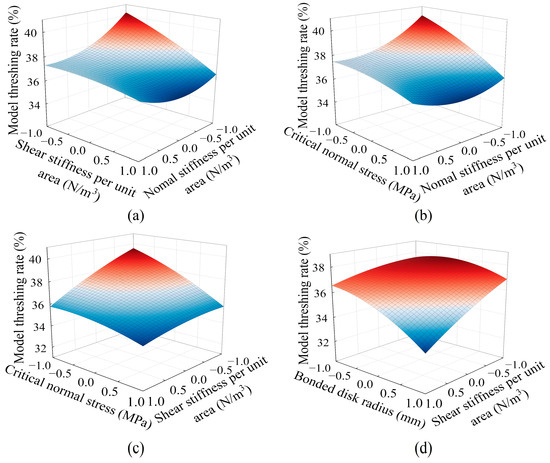 The Plackett–Burman screening test, steepest ascent test, and Box–Behnken optimization test were employed to optimize the bonding mechanical parameters of the grain stalk. Five bonding parameters—normal stiffness per unit area, shear stiffness per unit area, critical tensile stress, critical shear stress, and bonded disk radius—were selected as experimental factors. These parameters were optimized based on the experimental index of the threshing rate of the rice model under impact load. To minimize the number of tests and experimental factors, the bonding parameters for grain stalk–grain, grain stalk–primary branch, and grain stalk–grain stalk were considered equal, while the bonding parameters for grain stalk–grain stalk were optimized. The simulation parameters for other structures were averaged. The range of test factors was established through preliminary experiments, as detailed in Table 3.
