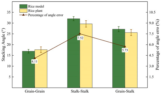 The stack angle test serves to evaluate the stacking condition of the rice plant under gravitational forces and to verify the contact characteristics of the rice plant model. The verification tests were conducted to assess the stacking angles between grain–grain, stem–stem, and grain–stem. The secondary stalk was selected for the test.