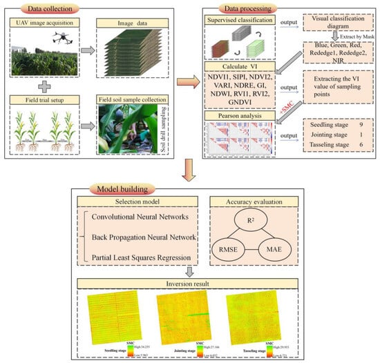 This paper aimed to investigate the impact of the soil background and image shadows on SMC inversion. First, supervised classification was used to remove soil background and image shadows. Then, Pearson correlation analysis was performed, showing a significant improvement in the correlation between independent variables (spectral indices) and the dependent variable (SMC). Finally, CNN, BPNN, and PLSR models were used to compare and analyze the inversion results at different growth stages, and their accuracy was evaluated.