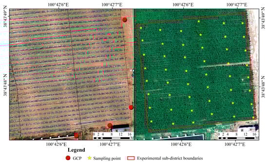 Sampling point layout. Note: Four ground control points (GCPs) were established within the study area, with sample points evenly distributed across the region. Precise coordinates were obtained using real-time kinematic (RTK) positioning. The UAV images were georeferenced and accurately corrected using Pix4D Mapper software by manually marking the control points.