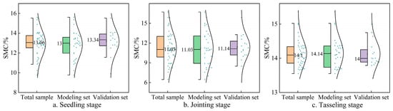 After UAV image acquisition, soil samples were promptly collected from the sampling points set according to Figure 4, and the SMC of the silage corn root zone was determined using the oven-drying method. Based on the depth of the primary root activity layer of silage corn, three depth levels were designed: 0–10 cm, 10–20 cm, and 20–30 cm. The average SMC across these depths was calculated as the SMC for each sampling point at 0–30 cm. Figure 5 shows the statistical results of the SMC sample data. The total number of soil moisture samples for the seedling, jointing, and tasseling stages was 48 for each stage. For each growth stage, 2/3 of the data was randomly selected for modeling, and the remaining 1/3 was used for validation. The specific dataset divisions are shown in Table 2.