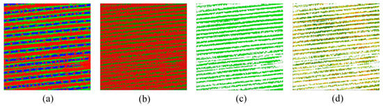 Extraction process of maize canopy reflectance. (a) Classification result. (b) Plant bands were extracted. (c) Canopy vector files were constructed. (d) Canopy reflectance was extracted.