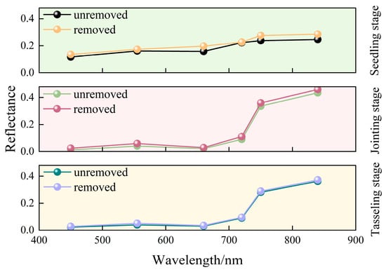 The average spectral data for each growth stage were calculated to compare the changes in canopy reflectance of silage corn before and after the removal of the soil background and image shadows. The results are shown in Figure 7. Among the different growth stages, the near-infrared band of the canopy spectral reflectance shows the most significant increase after the removal of the soil background and image shadows. The seedling stage exhibits a greater increase in canopy spectral reflectance compared to the jointing and tasseling stages.