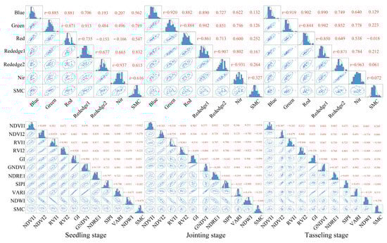 To mitigate potential overfitting in the inversion model, Pearson correlation coefficients were employed to conduct multivariate correlation analysis between the independent variables (multi-spectral remote sensing data and spectral information) and the dependent variable (SMC in the root zone of silage corn) [58]. Figure 8 shows the scatter plot matrix and Pearson correlation coefficients for each growth stage after removing the soil background and image shadows, displaying the results of normality tests on the data. The diagonal of the matrix plots shows univariate density estimates, representing the distribution of each feature, while the other parts of the scatter matrix depict linear relationships between different variables.
