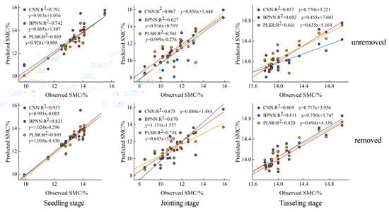 - At each growth stage, removing the soil background and image shadows improved the accuracy of SMC inversion. In the CNN-based inversion model, the R2 of the validation set increased by 20.33%, 0.92%, and 1.28% during the seedling, jointing, and tasseling stages, respectively, after removal. In the BPNN-based inversion model, the R2 increased by 10.65%, 6.86%, and 17.20% during the seedling, jointing, and tasseling stages, respectively, after removal. In the PLSR-based inversion model, the R2 increased by 2.87%, 31.55%, and 24.05% during the seedling, jointing, and tasseling stages, respectively, after removal. All three models showed the highest inversion accuracy during the seedling stage, with validation set R2 values of 0.953, 0.821, and 0.895, respectively.
