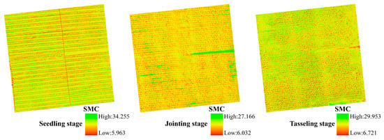 - Due to the varying spectral characteristics of different bands, the VI constructed from canopy reflectance at different growth stages will differ. The correlation between NDVI1, GI, SIPI, and SMC was not significant before and after removing the soil background and image shadows. During the seedling and jointing stages, the correlation between NDVI1, GI, and SMC was near zero. Similarly, during the jointing and tasseling stages, the correlation between SIPI and SMC was near zero, indicating a nonlinear relationship or no apparent association between them.