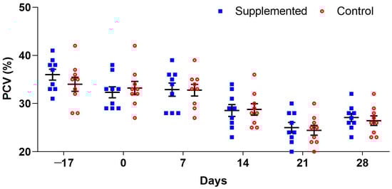 The initial PCV means were 36% (±1.12) in the supplemented group and 34% (±1.47) in the control group. From D7 onwards, these means showed a progressive decline until D21, when the lowest values were recorded: 25% (±1.08) in the supplemented group and 24% (±1.02) in the control group.
