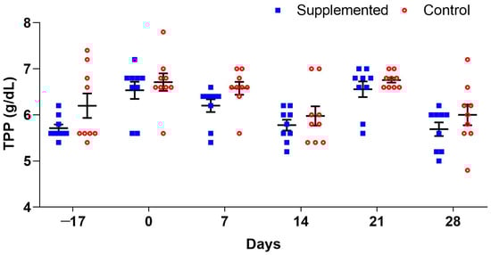 Total plasma protein concentrations fluctuated throughout the experiment but remained within the normal range for sheep (6.0–7.9 g/dL) [41]. The highest mean values observed in the supplemented group were 6.6 g/dL (±0.17) on D21, and on the same day, the highest mean value of the control group was 6.8 g/dL (±0.06). No influence of grape pomace supplementation was observed on the mean PCV or TPP concentrations (p > 0.05) at any collection point (Figure 1 and Figure 2). Nevertheless, there was a significant time * treatment interaction for TPP (p = 0.0089).