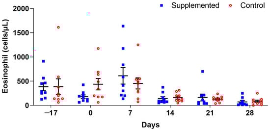 Blood eosinophil counts varied throughout the experiment, peaking seven days post-infection, with averages of 611 (±171.26) and 454 (±114.47) in the supplemented and control groups, respectively (p > 0.05). Subsequent collections showed a marked decrease in the average for both groups (Figure 3).