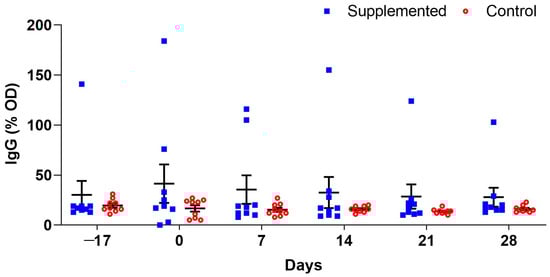 ELISA analyses showed a significant time * treatment interaction (p = 0.0099) with IgG levels consistently higher in the supplemented group. On D0, the supplemented group presented its highest mean 41.5 (±19.33) and the control group 16.5 (±3.11), but without presenting a significant difference (p = 0.0596) (Figure 4).