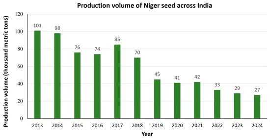 India ranks first in the production and export of Niger seed []. It is cultivated in the Andhra Pradesh, Madhya Pradesh, Orissa, Maharashtra, Bihar, Karnataka, Nagar Haveli, and West Bengal states of India, of which Madhya Pradesh is the largest producer. The graph in Figure 2 shows the highest production in the financial year of 2013 (101,000 MT) and the lowest production in the year of 2024 at 27,000 MT. Starting from the year of 2013, the production of Niger decreased, but in 2017, production slightly increased and declined again. Niger has a high oil content of around 40%, with a valuable fatty acid composition. However, its high unsaturated fatty acid content leads to poor keeping quality, which limits its wider use. Factors such as a lack of government interest in tribal cuisine, limited genetic variation, susceptibility to diseases, a lack of diverse varieties, shattering, self-incompatibility, less or low responsiveness to management inputs [], and little research attention have mainly contributed to a decline in production, and Niger has mainly remained as an underutilized oilseed crop []. There is a need to increase the production of Niger.