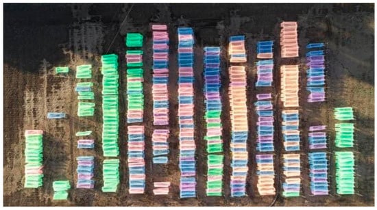 A drone shot of a seed multiplication/regeneration block for Niger breeding at the Indian Council of Agricultural Research-National Bureau of Plant Genetic Resources (ICAR-NBPGR) Campus, Akola, India, dated 15 December 2020. These are the 1700 different Niger accessions along with the checks used for seed multiplication. From the left border, 2 rows are checks JNS 28 and JNS 30; the middle 9 rows are 1700 accessions for seed multiplication; and from the right border, 2 rows are checks JNS 9 and IGPN 2004-1.