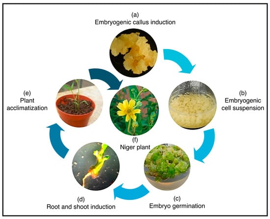 Plant tissue culture in Niger offers a promising avenue for agricultural advancement. This technique enables the rapid propagation of elite varieties, disease-free plant production, and genetic improvement of crops’ crucial traits [,]. Niger has been extensively studied in cell and tissue cultures, with regeneration reported from various explants, including leaves [,,], anthers [,,], cotyledons, and hypocotyls [,,]. Tiwari et al. [] highlighted the utility of anther culture in developing homozygous lines, which can be incorporated into breeding programs for hybridization. It was found that somatic embryogenesis (Figure 4) through suspension cultures has great potential. It can help carry out in-vitro variant selection and crop improvement for crops that are tolerant to biotic and abiotic stresses [].