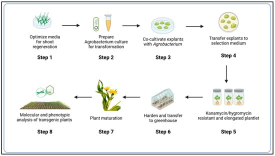 Protocol for Agrobacterium-mediated transformation of Niger. Step (1), optimization of media for shoot regeneration; step (2), Agrobacterium tumefaciens strain (e.g., EHA101) preparation for genetic transformation; Step (3), co-cultivation of explants with Agrobacterium; step (4), transfer on selection medium (MS medium containing 1 mg/L BA, 50 mg/L kanamycin, and 50 mg/L hygromycin); step (5), separation of resistant and elongated roots (3–4 cm long) and transfer to rooting medium; step (6), hardening and transfer to greenhouse; step (7), plant maturation; step (8), molecular and phenotypic analysis of transgenic plants (created in https://BioRender.com).