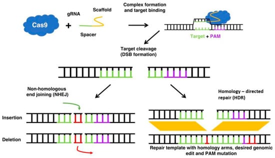 CRISPR-based genome editing methods, including CRISPR/Cas9, CRISPR/Cpf1, base editing, and prime editing, have shown promise in improving crop genetics and elite characteristics []. CRISPR-Cas proteins, including fCas9, Cas12, Cas13a, and Cas13b, offer new prospects for the enhancement of crop research [,,,,,]. CRISPR/Cas systems modify eukaryotic DNA by creating a guide RNA (gRNA) that matches the target sequence. This gRNA has a protospacer motif of around 20 base pairs, bordered by site-specific homology sequences. In the CRISPR-Cas9 system, Cas9 binds to a protospacer motif in gRNA and forms a complex with the target site. Cas9 interacts with the protospacer adjacent motif (PAM). The PAM catalyzes a double-strand break (DSB) in the host DNA, with three base pairs upstream []. The host cell’s DNA repair machinery can mend the cut by either homology-directed repair (HDR) or non-homologous end joining (NHEJ) []. The NHEJ repair may lead to small deletions, and insertion can cause gene function knockouts and knockdowns, whereas HDR can result in DNA sequence modifications, including gene knock-ins or gene replacements (Figure 6).