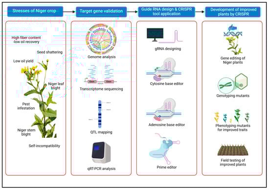 Other CRISPR-Cas-based systems, such as base editing and prime editing, may modify DNA sequences through the chromatin structure or base editing, eliminating the requirement for cuts to DNA strands []. Because of its adaptability, CRISPR-Cas9 technology has emerged as a valuable tool in genome editing and can play an important role in studying gene functions and improving Niger and other oilseed crops (Figure 7). There is a need for understanding or deciphering the genes involved in pod dehiscence as it is causing major loss in oilseed crops []. Pod dehiscence significantly reduces yield in oilseed crops, including soybean, sesame, and oilseed rape, both before and after harvest. Oilseed crop breeding aims to minimize shattering loss. Mutant research has identified the genes responsible for shattering resistance. Minimizing pod shattering through biotechnology is a top objective. The identification of genes involved in pod dehiscence is necessary to develop the plant’s tolerance or resistance to pod shattering. For instance, in Brassica napus, a comprehensive approach led to the discovery of BnTCP8.C09 as the gene accountable for pod shattering []. The removal of the pod dehiscence 1 (PDH 1) gene led to decreased pod shattering in soybean []. Self-incompatibility is another constraint that limits the production and productivity of oilseed crops. Pollination and fertilization result in the production of seeds, which is the economically valuable aspect of oilseeds. The presence of self-incompatibility impedes the development of inbred lines, and overcoming self-incompatibility is a key breeding goal in oilseed crops like Niger. Researchers have successfully achieved self-incompatibility by modifying important genes such as S-receptor kinase and M-locus protein kinase in oilseed rape [].