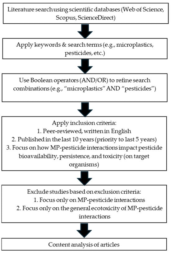 The narrative review involved a systematic literature search using reputable scientific databases, including Web of Science, Scopus, and ScienceDirect. The keywords and search terms included combinations of microplastics, plastic pollution, pesticides, herbicides, fungicides, insecticides, bioavailability, persistence, degradation, adsorption, and toxicity. Boolean operators (AND/OR) were employed to refine the search. Examples of the combinations were: (1) (“microplastics” OR “plastic pollution”) AND (“pesticides” OR “herbicides” OR “fungicides” OR “insecticides”, (2) (“microplastics” AND “bioavailability” AND “pesticides”), and (3) (“microplastics” AND “persistence” AND “pesticides”). The inclusion criteria are: (1) the articles must be peer-reviewed and written in English; (2) the articles must have been published within the last 10 years, with priority given to those published within the last 5 years; (3) the articles must indicate the implications of MP–pesticide interactions on the bioavailability, persistence, or toxicity of pesticides; and (4) the effects on toxicity must focus on target organisms to permit discussion of the agricultural implications. Studies that focus solely on MP–pesticide interactions and the influencing factors and on general ecotoxicity were excluded. Figure 1 shows the flowchart of the literature review process.
