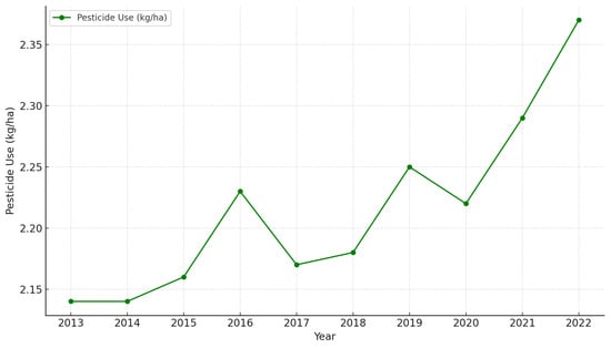 Global pesticide use per hectare (2013–2022) [39].