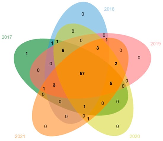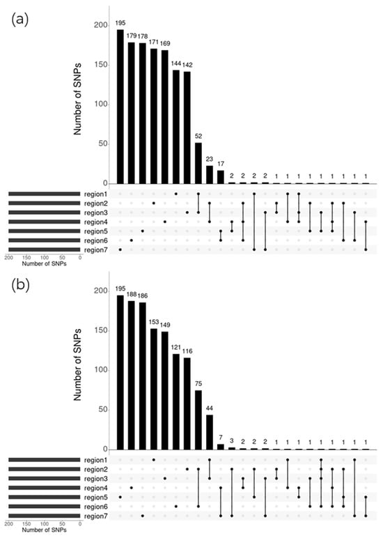 Similarly, each small ecological region contained over 110 SNPs significantly associated with yield that did not overlap with other small ecological regions in 2021. The number of these SNPs varied, ranging from 116 to 195, with Region 5 notably having 195 significantly correlated SNPs. This demonstrates that more SNPs are linked to yield under specific environmental conditions as well. Across two regions, there were 13 groups of SNPs that were significantly correlated, with the highest number of 75 shared between Region 2 and Region 6. In three regions, there were two groups of SNPs that exhibited significant correlations, and in four regions, there was one such group (Figure 9b).