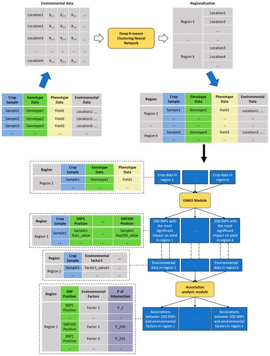 Based on the aforementioned considerations, this study employed data mining and clustering techniques using the DKMCNN to analyze meteorological data. The obtained clustering results were subsequently utilized to subdivide the crop growing area into distinct ecological regions of various types and scales. Following this, varietal environment interaction analysis experiments were conducted within each small ecological region. Initially, the study area was divided into different small ecological regions, and then genome-wide association analysis (GWAS) and analysis of variance (ANOVA) were performed in each of these regions to accurately determine the relationship between environmental factors and single-nucleotide polymorphisms that have the greatest effect on yield.