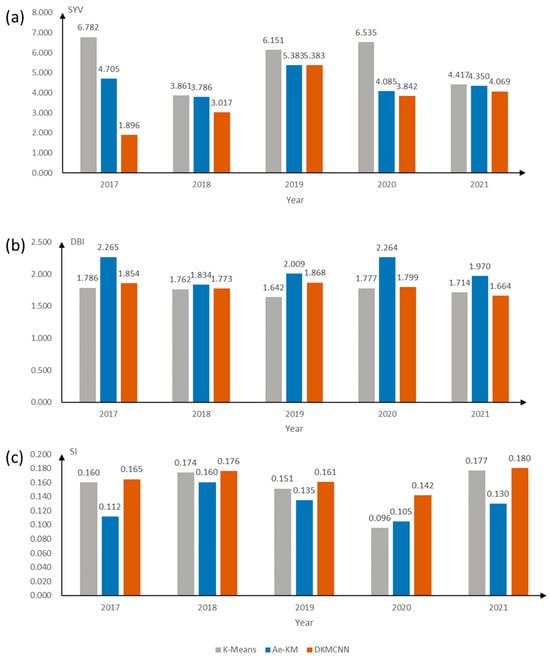 The performance of the three algorithms on the clustering results of Dataset 1 in terms of the SYV, DBI, and SI. The x-axis represents the years, and the y-axis represents the values of each algorithm on the evaluation metrics, the SYV (a), DBI (b), and SI (c), gray represents K-Means, blue represents Ae-KM, and red represents the DKMCNN.