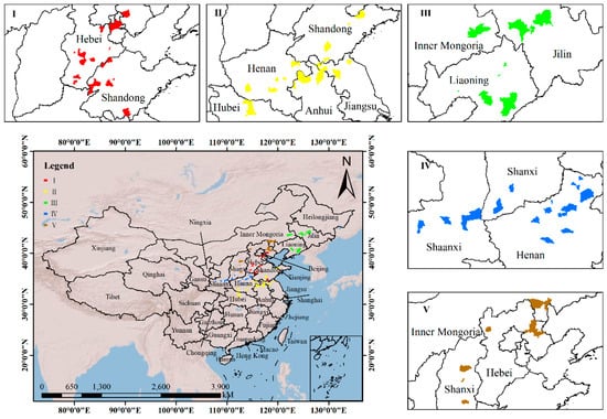 To investigate the possibility of reasonably dividing the trial locations into distinct small ecological regions based on the clustering analysis of environmental data, we used the DKMCNN algorithm to cluster meteorological data from Dataset 1 for delineating these small ecological regions. The research findings demonstrate that utilizing the DKMCNN clustering algorithm for meteorological data enables the effective categorization of diverse environmental test locations into distinct ecological zones. The DKMCNN clustering results from the 2017 Zhengdan 958 trial locations, as depicted in Figure 6, reveal the division of these locations into five distinct ecological regions. The first category primarily comprises experimental locations located in Hebei and northern Shandong. The second category encompasses experimental locations situated in southern Shandong and southern Henan. The third category includes experimental locations in Jilin, Liaoning, and northeastern Inner Mongolia. The fourth category consists of experimental locations located in Shanxi, Shaanxi, and northern Henan. Lastly, the fifth category encompasses experimental locations situated in northern Hebei. These locations are all situated in low-lying plains with minimal elevation variations. Consequently, the demarcation of the smaller ecological regions generally corresponds to their latitudinal distribution and proximity to the ocean. These findings demonstrate that the DKMCNN algorithm proposed within this study effectively categorizes test locations with similar climate environments, thereby substantiating its efficacy in delineating small-scale ecological regions across a variety of test locations. The DKMCNN clustering algorithm further classifies the trial locations from 2018 to 2021 into distinct small ecological regions, as illustrated in the Appendix A, Figure A1, Figure A2, Figure A3 and Figure A4, showing the division results for these four years. Among the research areas over the five-year period, 57 counties exhibited overlap. In the annual clustering analysis, 38 counties consistently remained in the same cluster throughout all five years, while 17 counties were categorized within the same cluster for four out of the five years, representing 86% of the total overlapping area. This indicates a high degree of consistency in the clustering results across different years. However, inter-annual climatic variations may lead to some counties being assigned to different clusters in certain years.