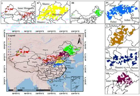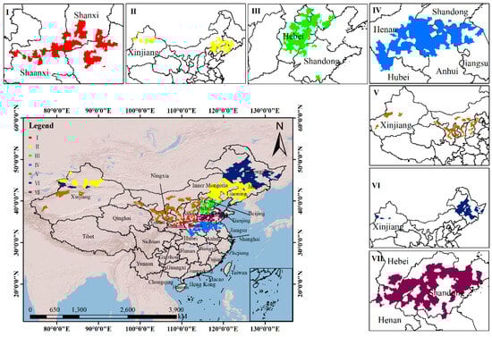 In further investigating the interaction between maize genotype and environment, we chose the DKMCNN method to conduct deep feature extraction and clustering on the meteorological data from the trial locations in Dataset 2. In 2020, meteorological data from 70 varieties were utilized to cluster into small ecological regions, resulting in seven distinct small ecological regions (Figure 7). Similarly, in 2021, meteorological data from 51 varieties at the maize variety field test sites were used for clustering into small ecological regions, yielding seven distinct regions again (Figure 8). Notably, the inclusion of more meteorological data in the dataset for 2020 enables them to reflect the overall ecological and climatic changes in China more comprehensively.